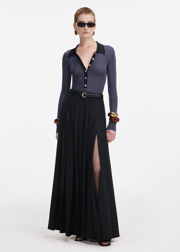 Self Portrait's Black Pleated Twill Maxi Skirt in Black.