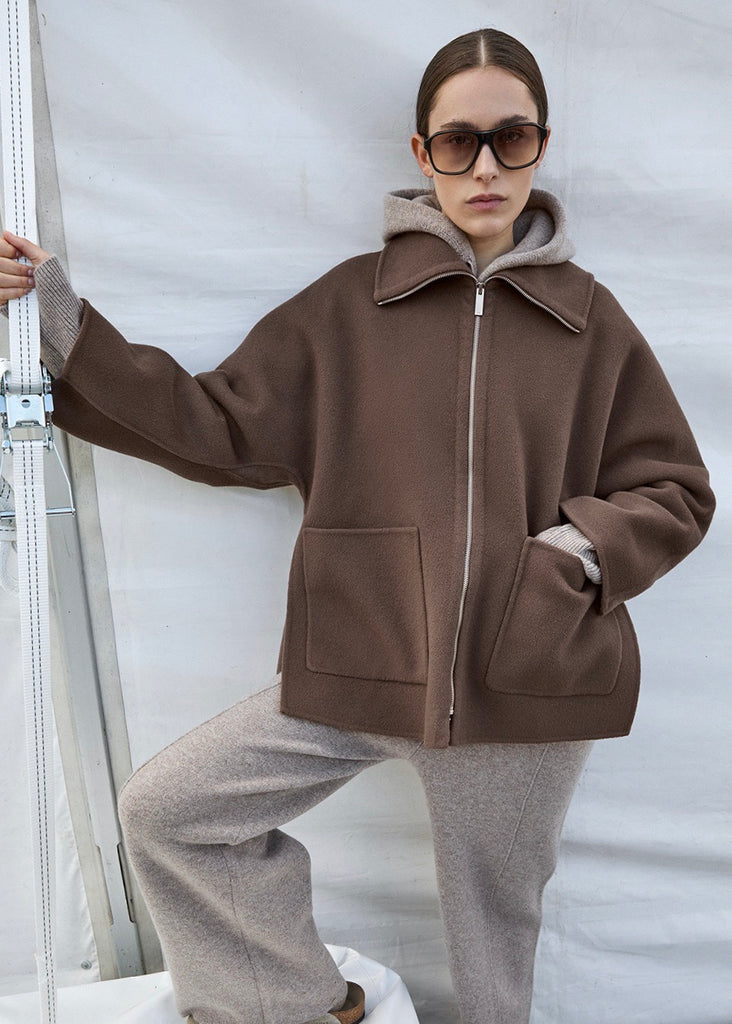 Extra Wool Zip-up Half Coat (Brown)