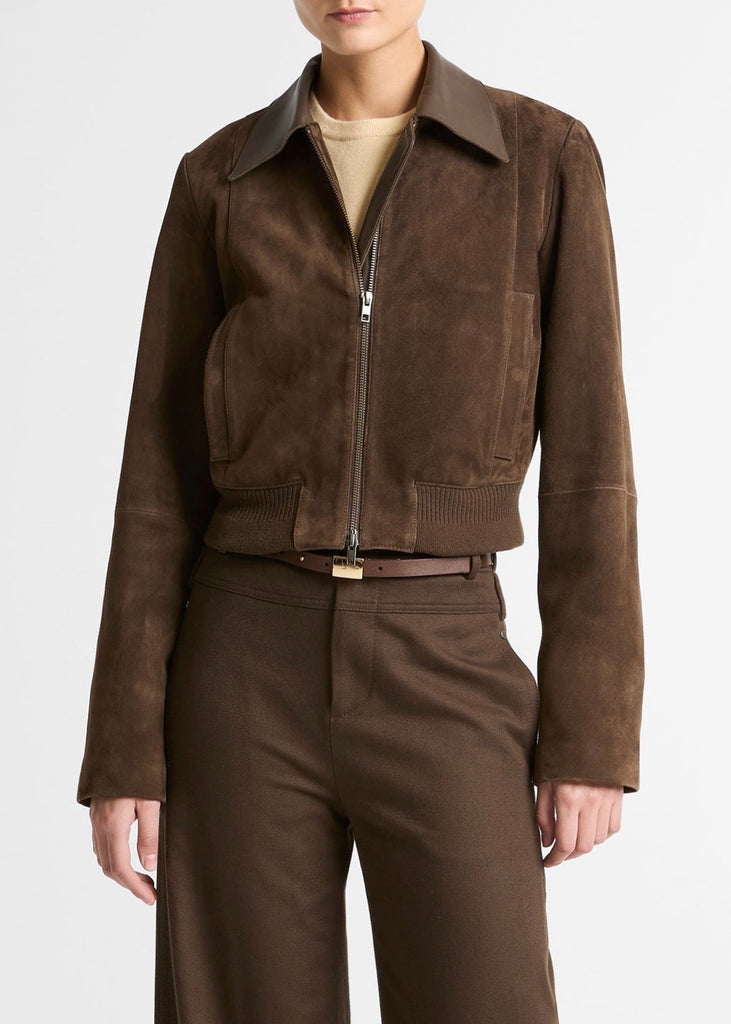 Vince's Suede Shrunken Bomber in Willow.